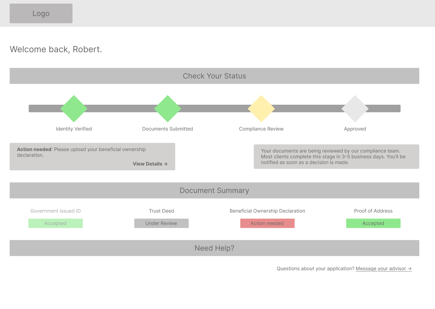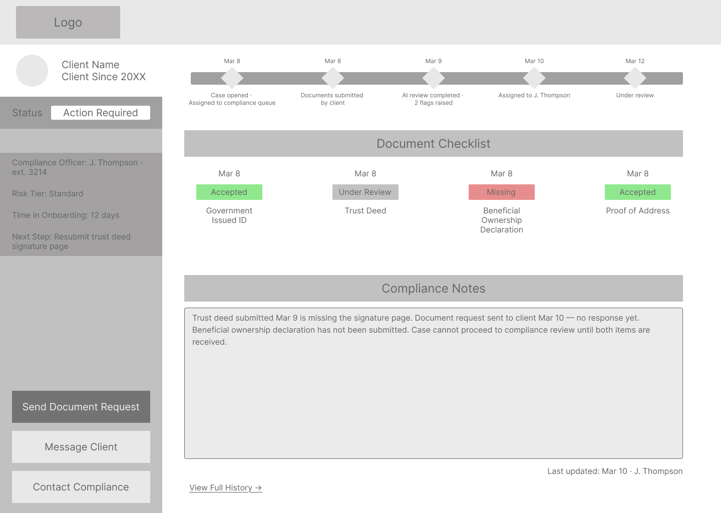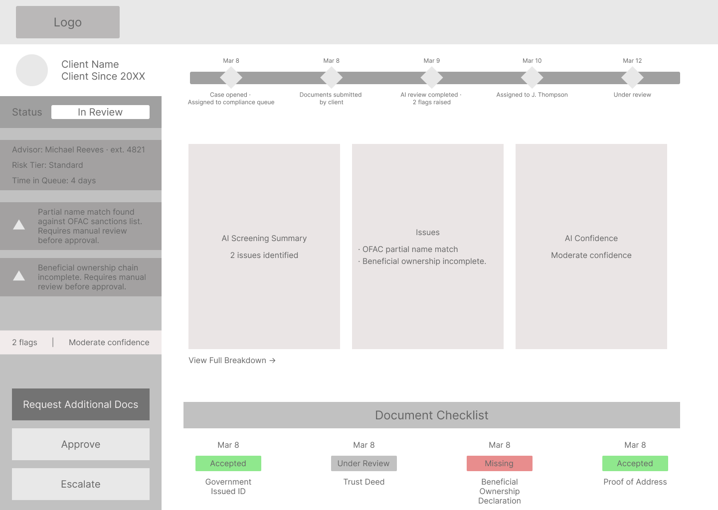 In the experience I designed against, status changes happen inside the system, invisible to the client and advisor. The AI makes determinations it does not explain. Document rejections go out without context. Every handoff between the three parties is a potential failure point, and most of those failures happen silently.