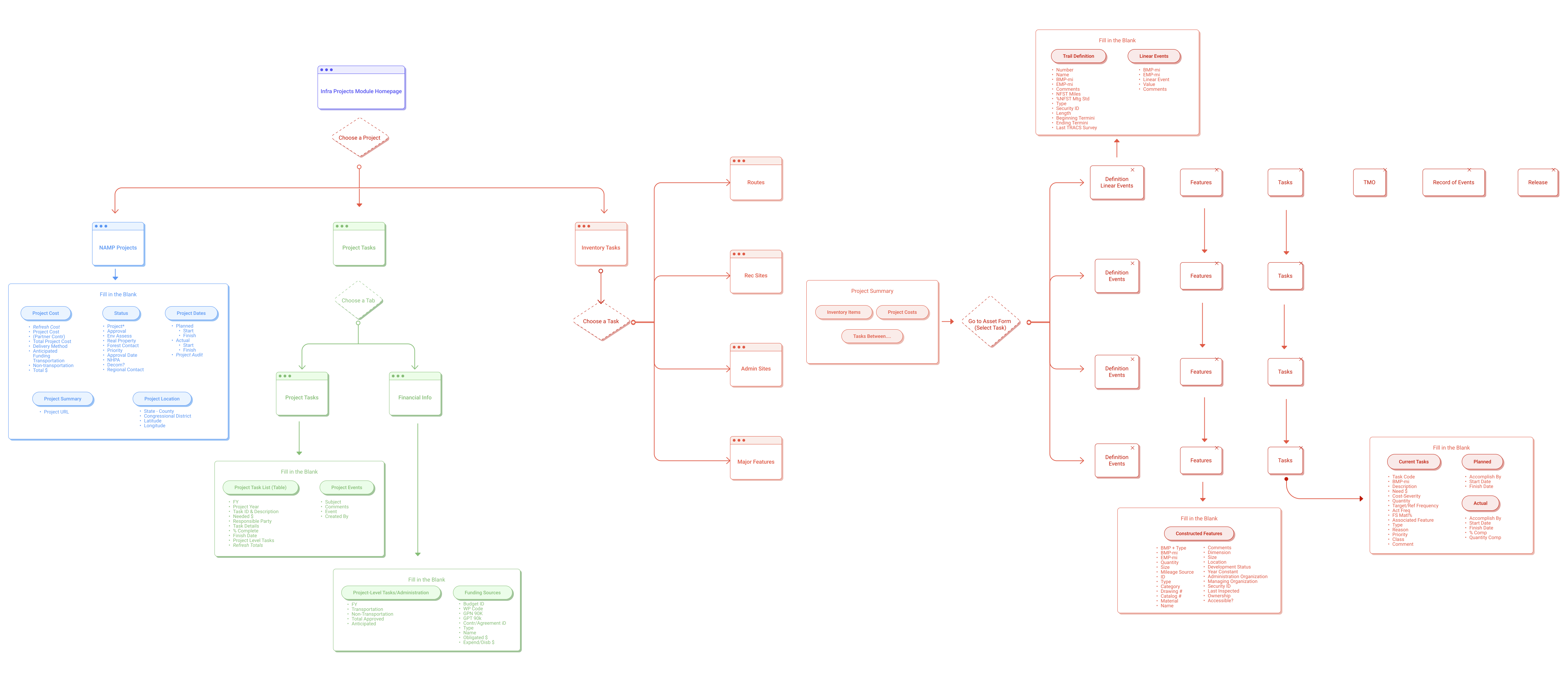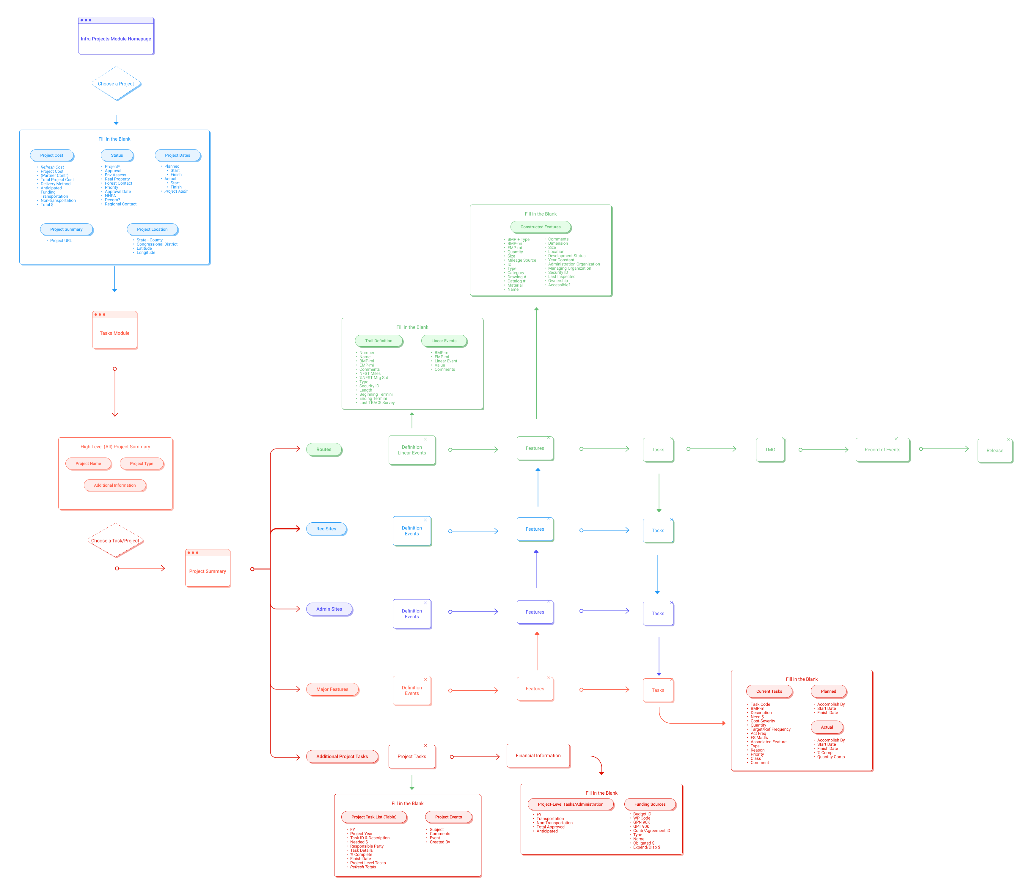 Persistent left sidebar shows all task types (Routes, Rec Sites, Admin Sites, Major Features) in an expandable tree. Users see the full project structure and jump directly to any task.